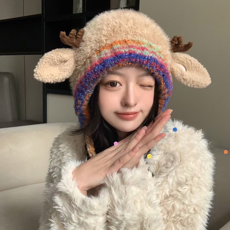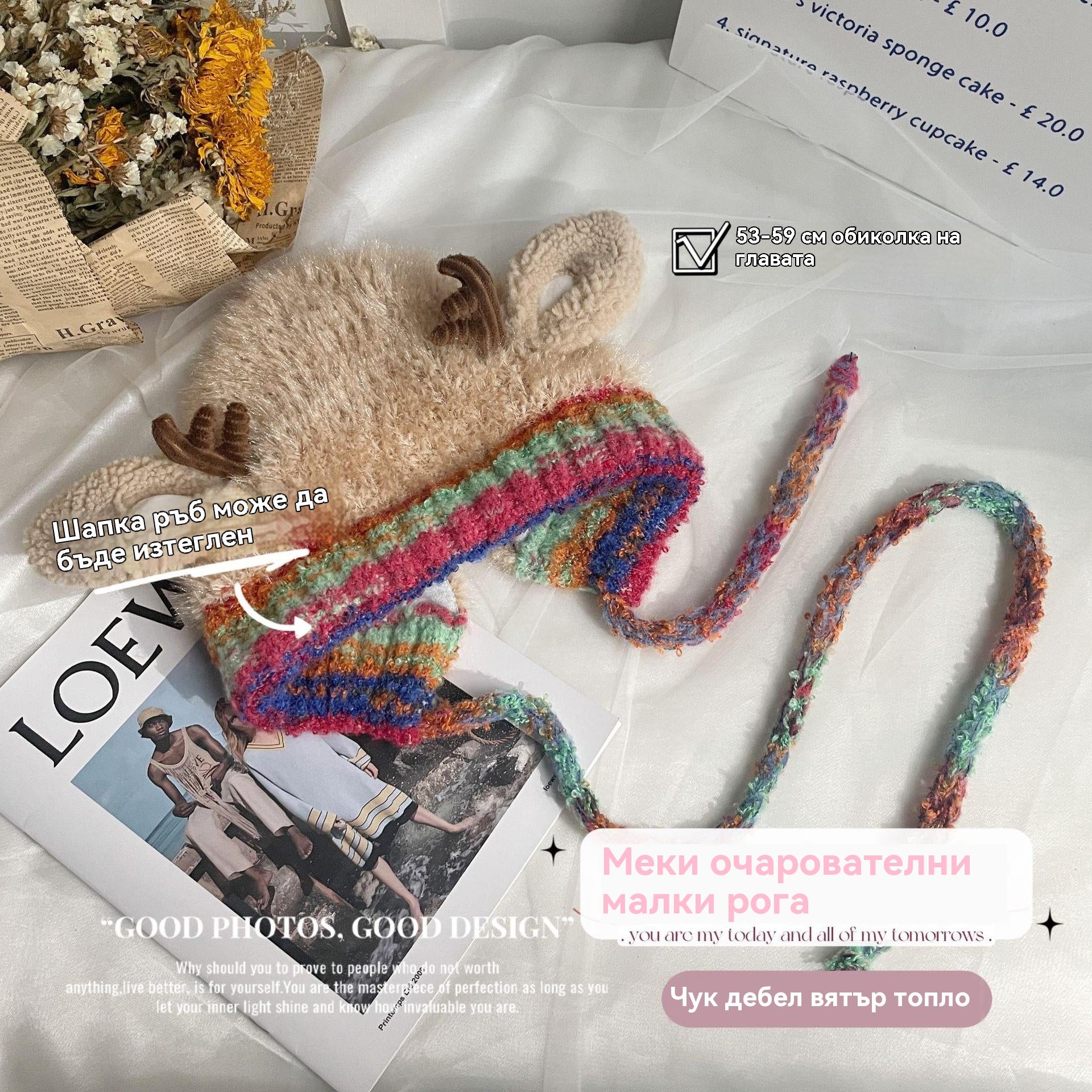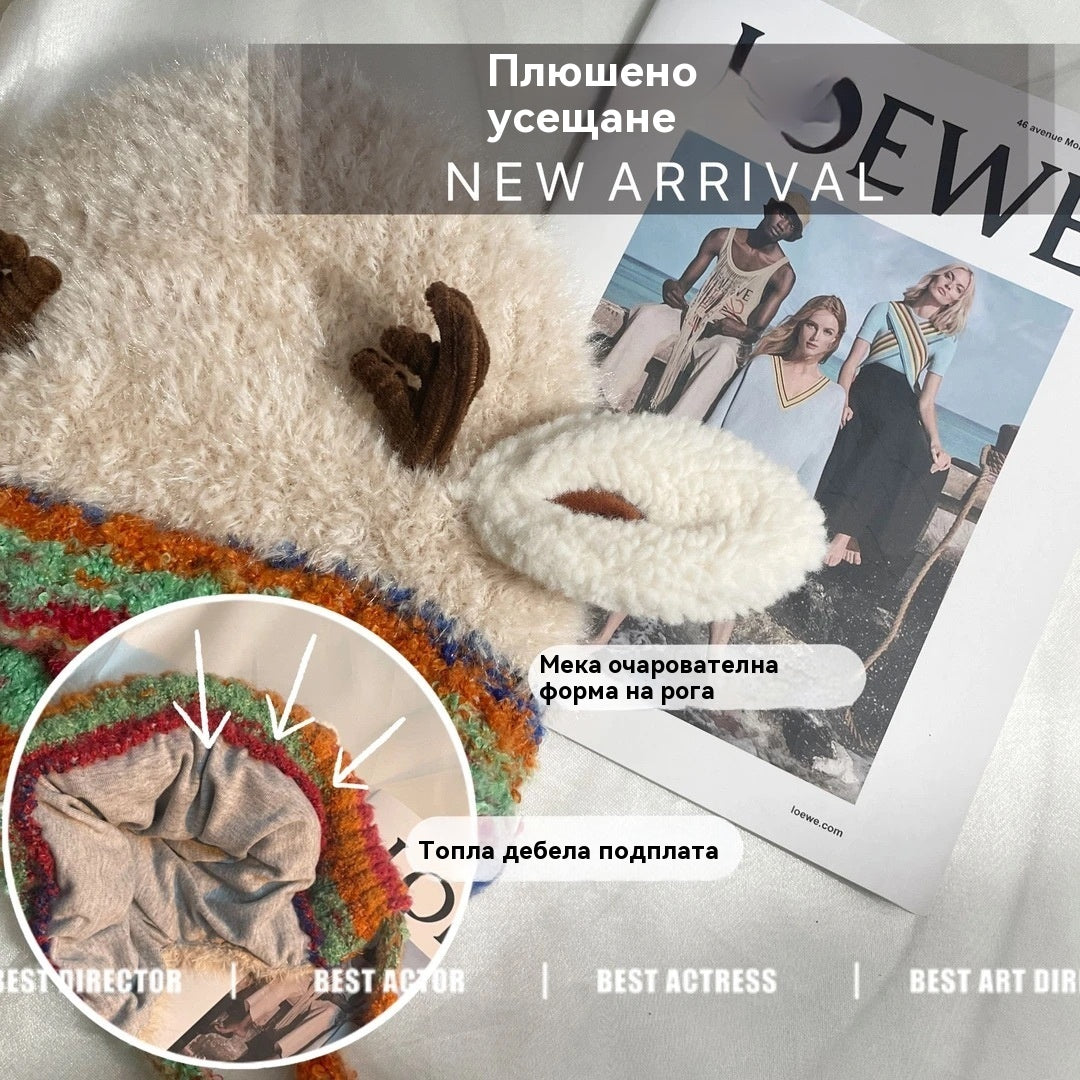 Сладка плюшена шапка от еленови рога за жени, топла плетена шапка с презрамки и ушички за есен и зима.