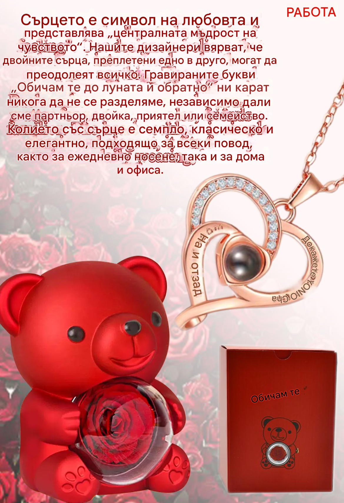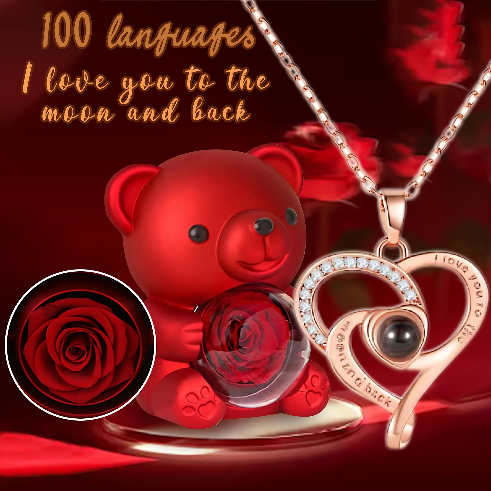 ✨Колие във формата на сърце, подарък за Свети Валентин + очарователно плюшено мече от консервирана роза - романтичен подарък за Деня на майката, сватби, годишнини и Свети Валентин.