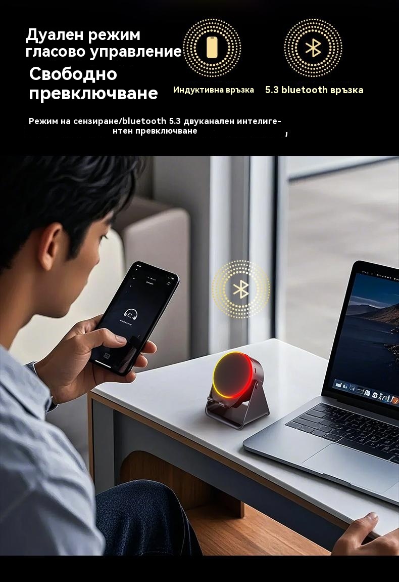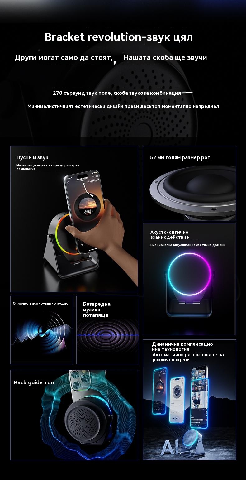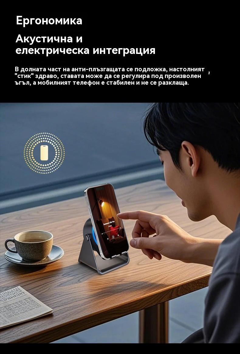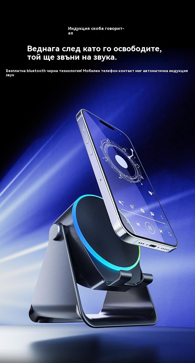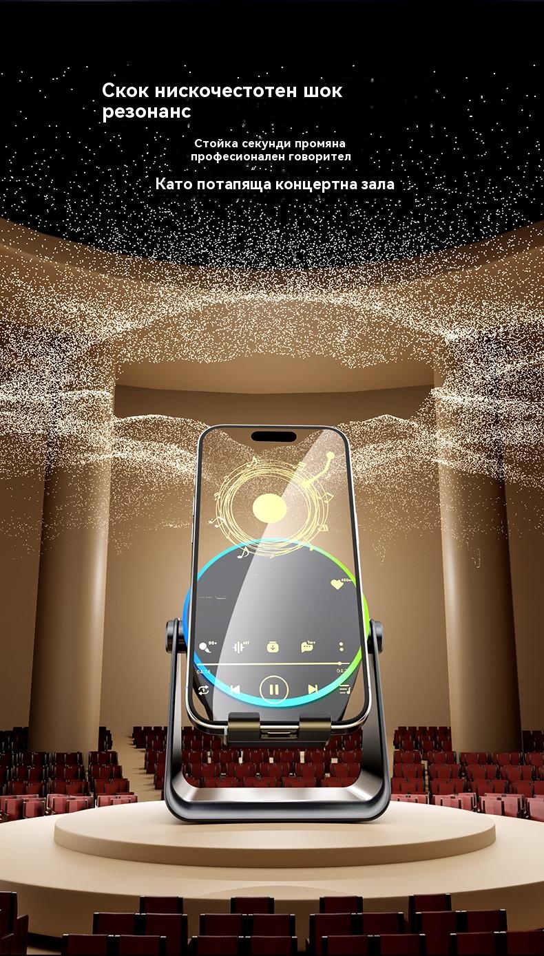 🔥📢 50% отстъпка! Bluetooth високоговорител 5 в 1 с безжично зареждане и регулируема стойка за телефон 🎶⚡